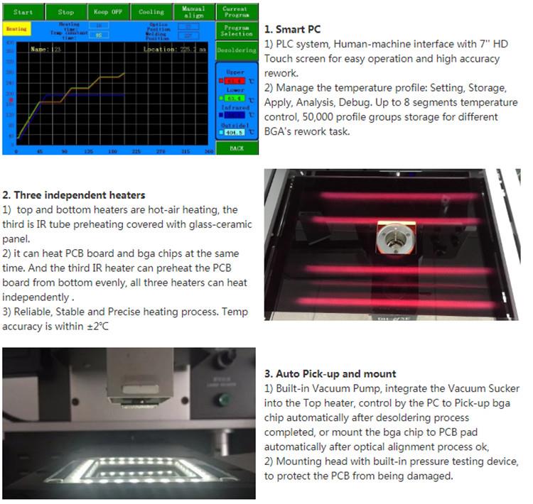 ए: डिंगhua बीजीए रीववर्क मशीन एक ही समय में पीसीबी बोर्ड और बीजीए चिप्स को गर्म कर सकती है। और मरम्मत प्रक्रिया के दौरान पीसीबी से विरूपण से बचने के लिए, तीसरा आईआर हीटर पीसीबी बोर्ड को समान रूप से नीचे से गरम कर सकता है। सभी तीन हीटर स्वतंत्र रूप से गर्मी कर सकते हैं।